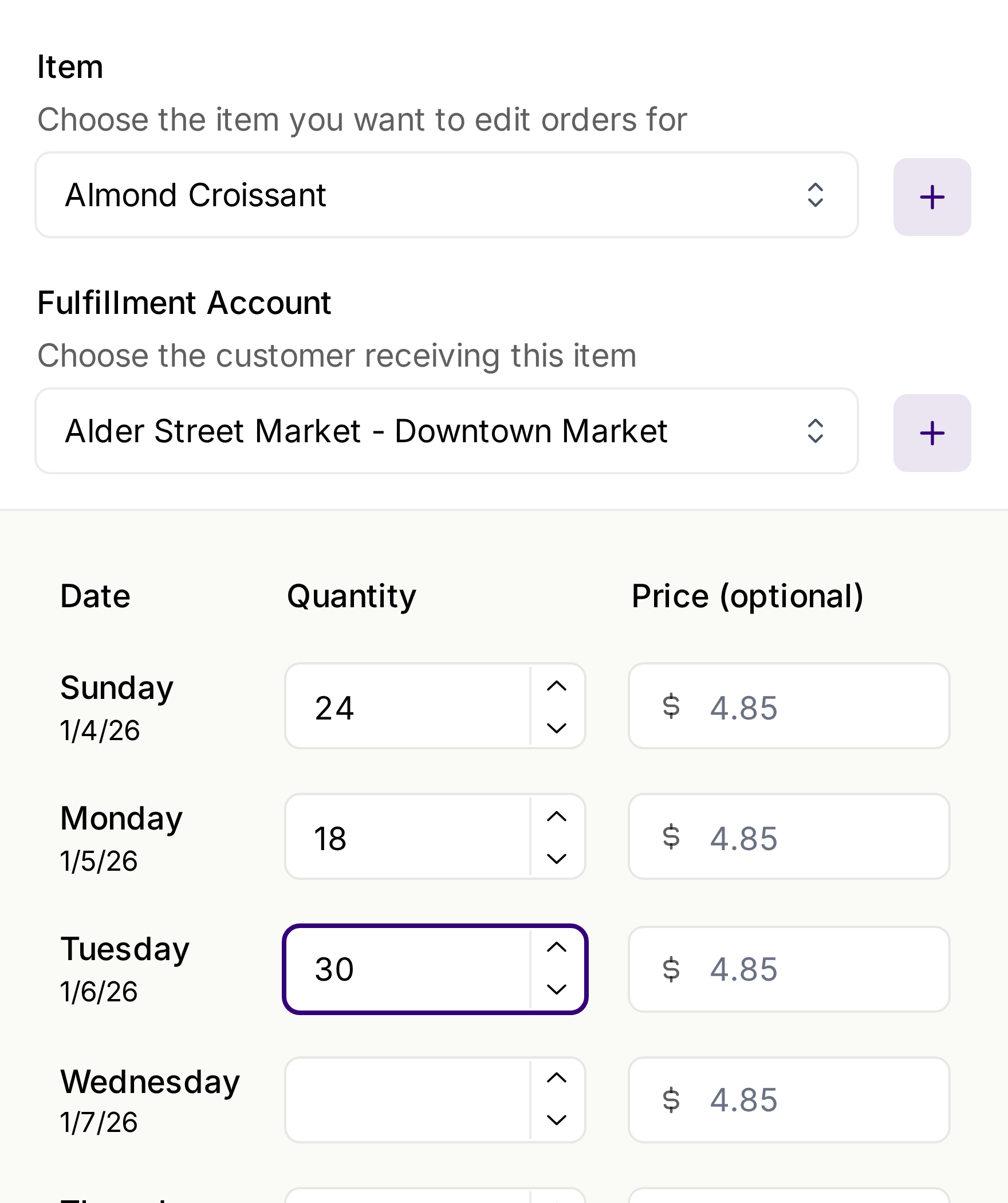 Lyravine assumes orders repeat on a weekly cycle until you change them. Update a quantity once, and it automatically applies to future weeks.